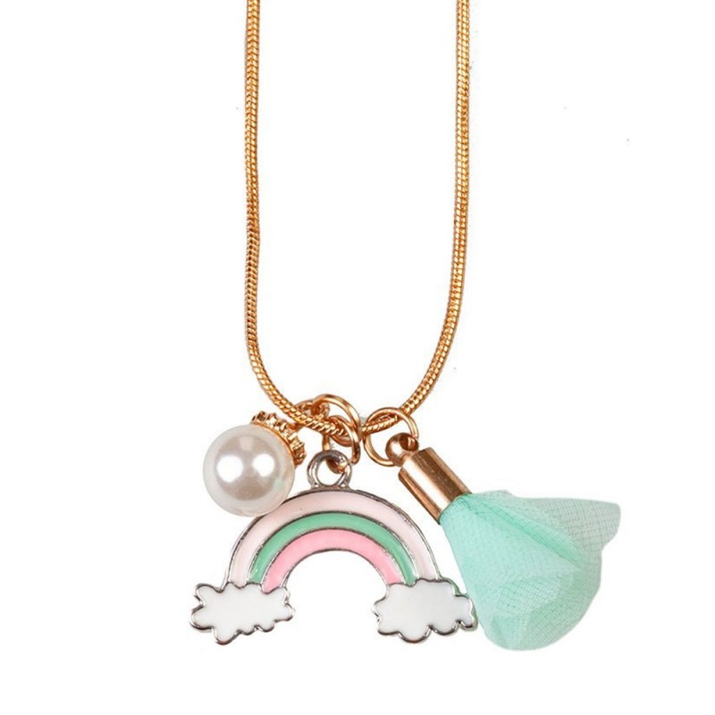 The rainbow features a touch of glitter and matched the mint tassel. Finally, the pearl pendant adds a bit of class to this fun gold necklace.
