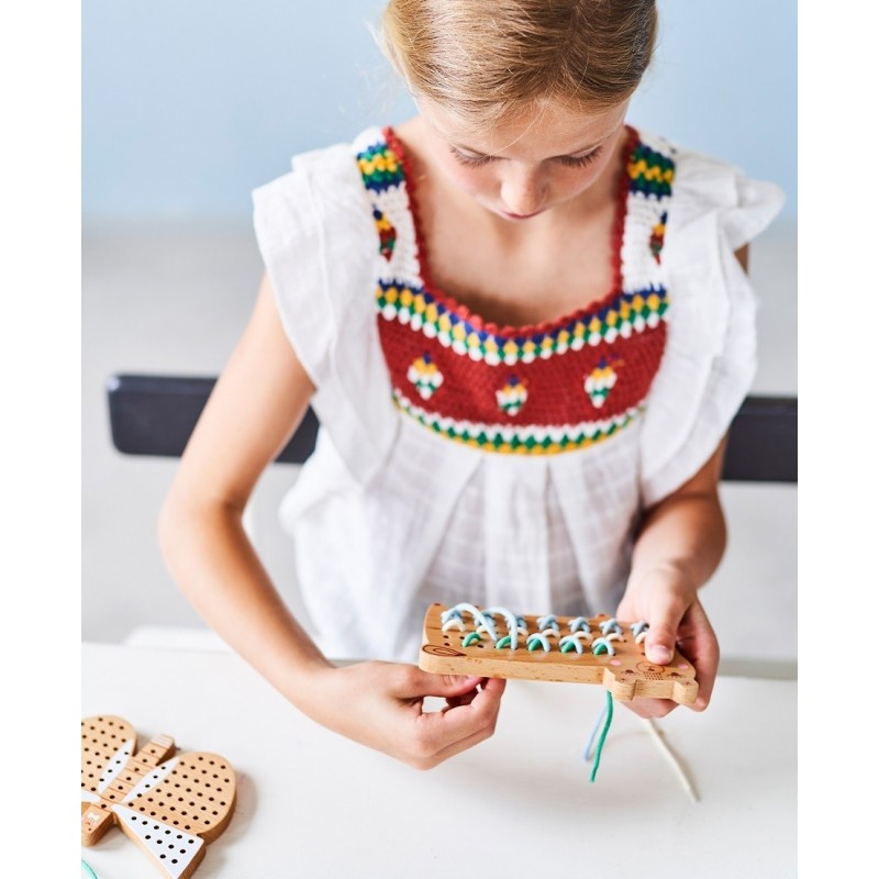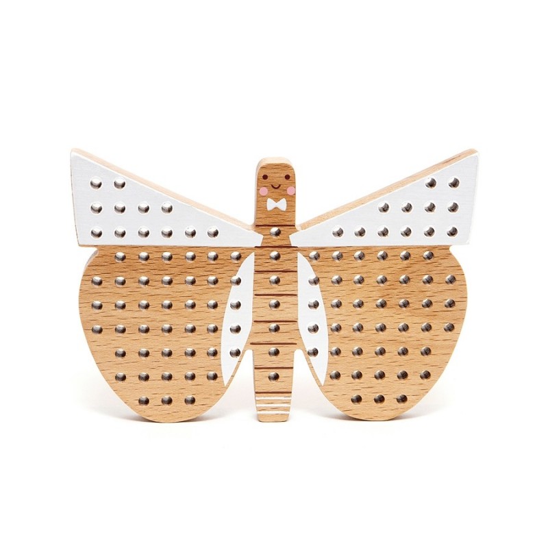 The set contains a wooden butterfly, 3 waxed cotton strings in great colours and a cotton bag to take this beautiful butterfly